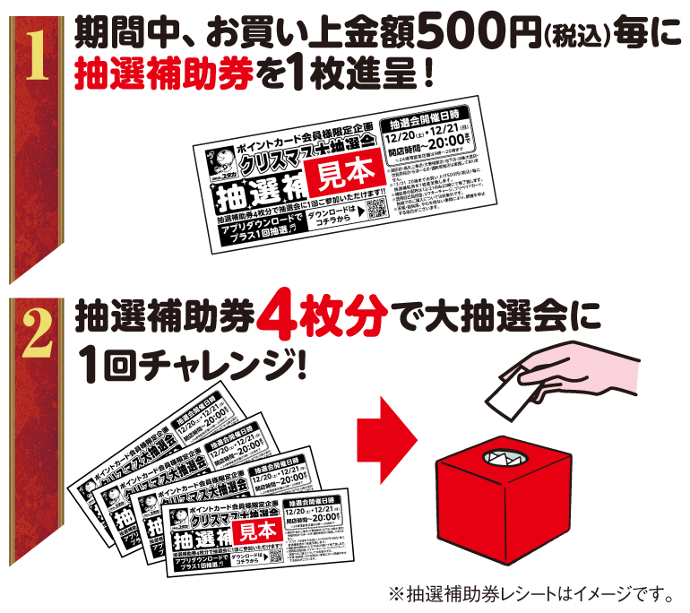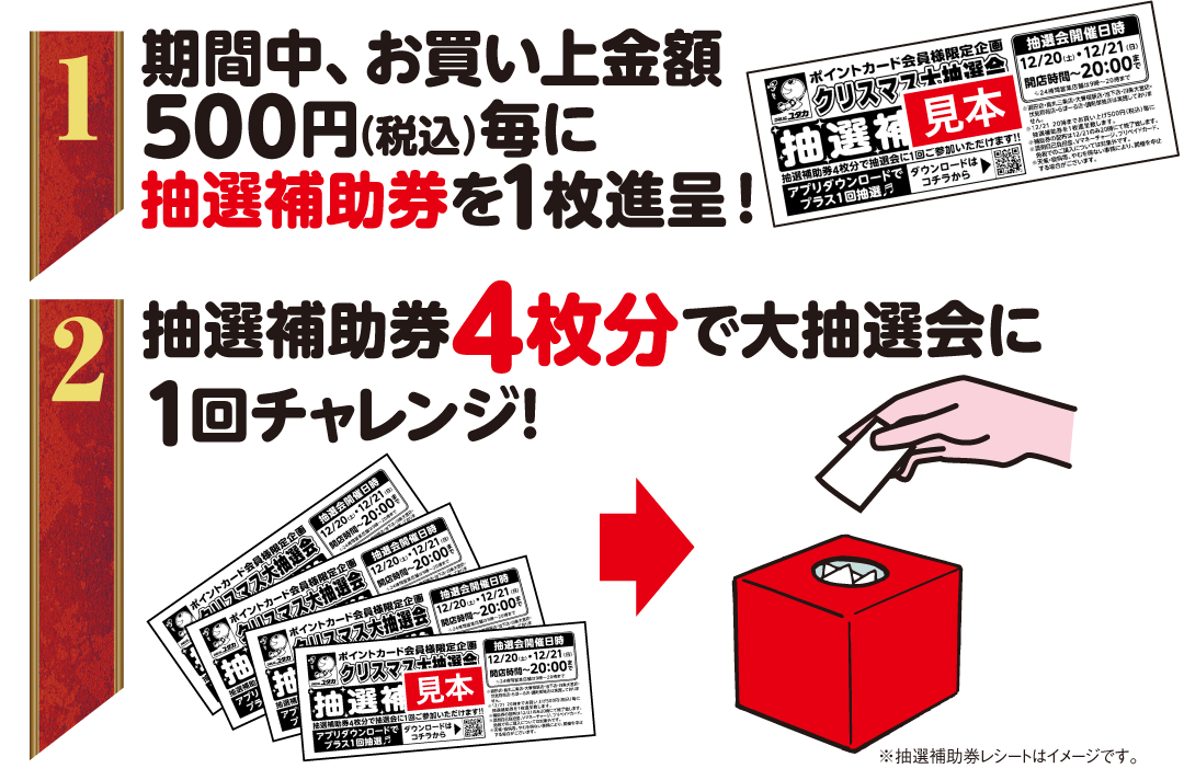 - 抽選補助券4枚以上とアプリに表示される優待券をご提示いただければ、1回抽選会に参加いただけます。