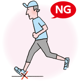 かかとから着地すると、足への衝撃が強くなり、すねやふくらはぎに負担がかかります。
