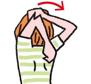 腕を頭の後ろへ回し、反対の手で肘をつかんで下へ引っ張る。