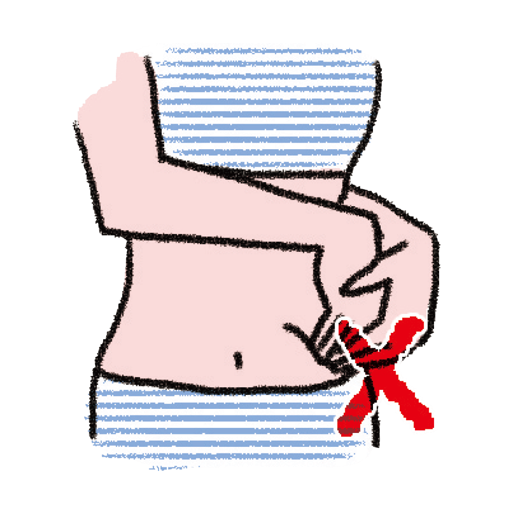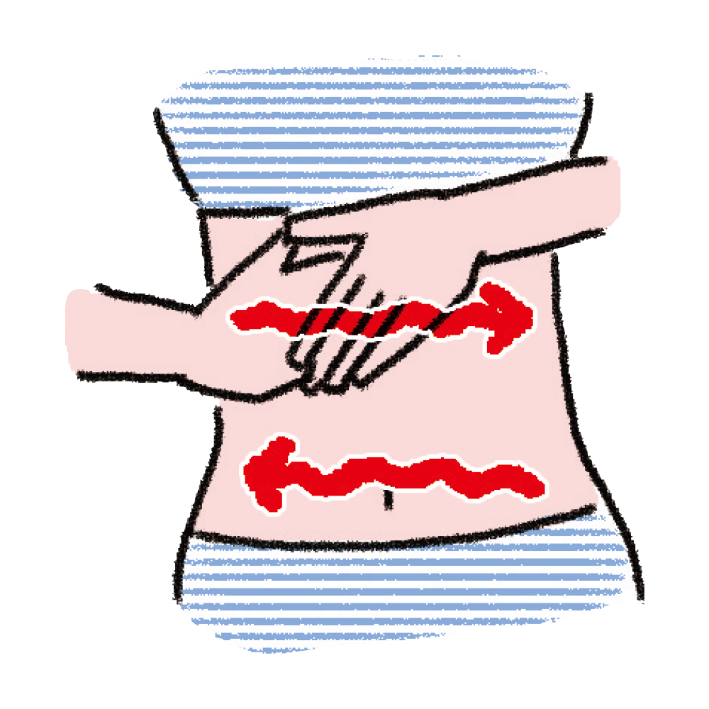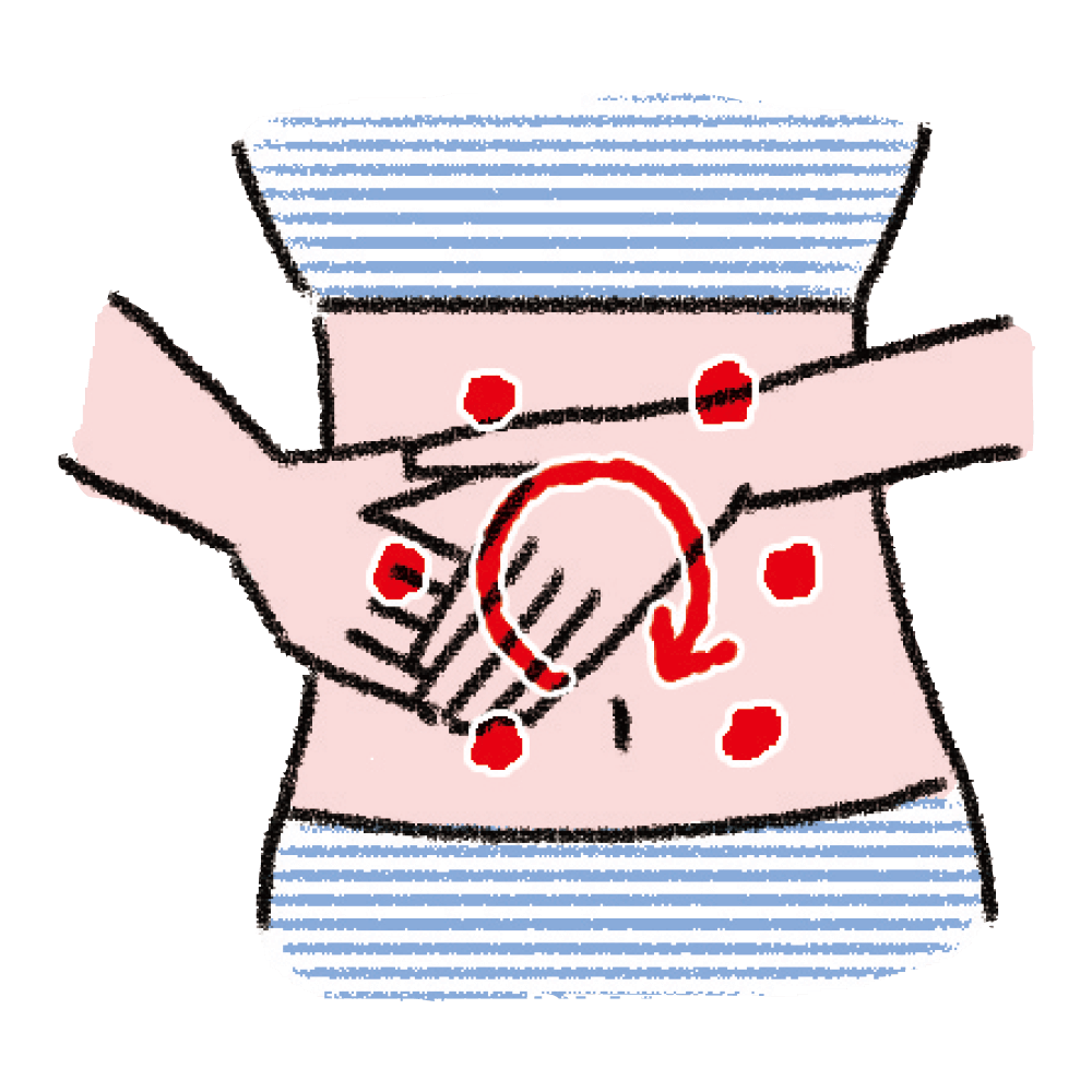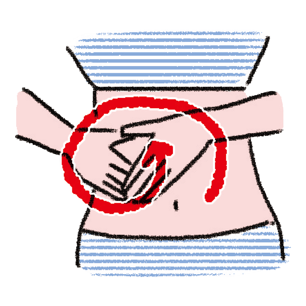 ①両手の指を重ねて「の」の字を書くように、おへその周りを時計回りにさする。
