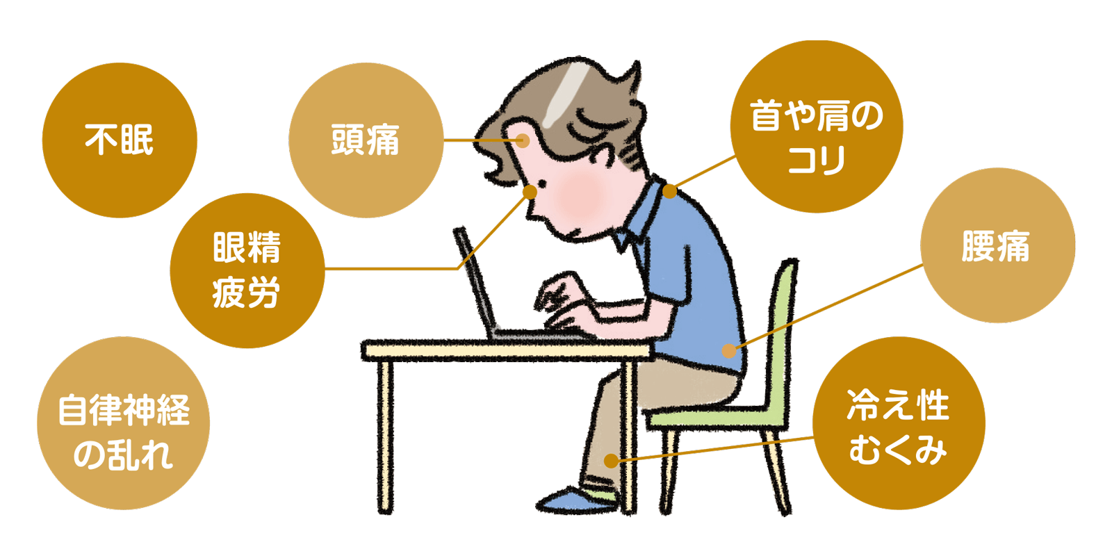 長時間同じ姿勢でいると、血行不良により疲労が溜まりやすくなります。そして筋肉が固まり、コリや痛みを引き起こします。また脳が緊張や集中を強いられるため、自律神経のバランスが崩れ、倦怠感を感じやすくなります。