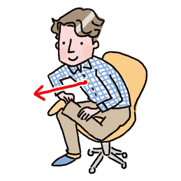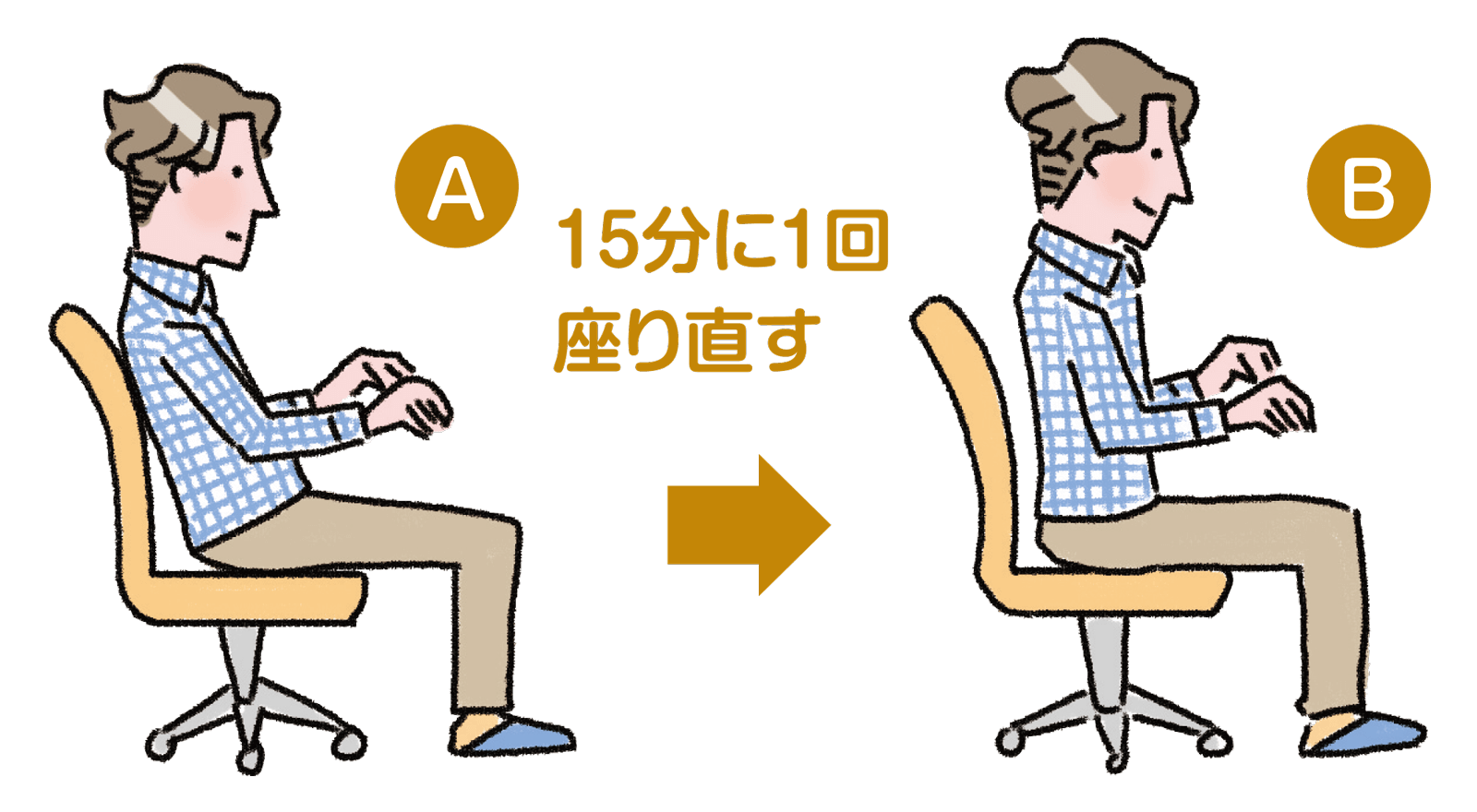 長時間座っていると、だんだんAのような座り方になりがちです。15分に1回、Bのような骨盤を立てた姿勢に座り直しましょう。