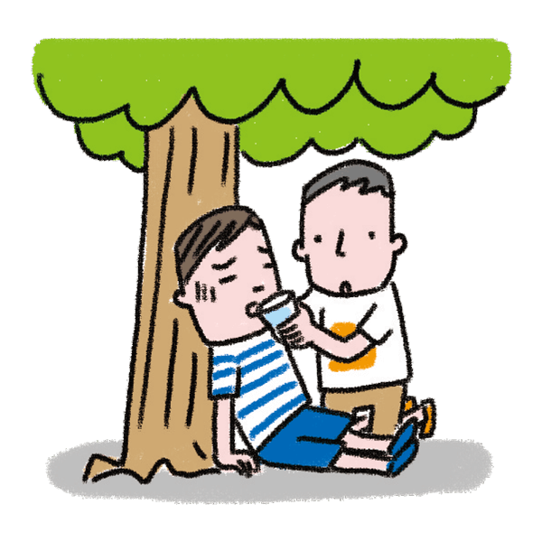 涼しい場所へ移動し、体を冷やします。経口補水液やスポーツドリンクで水分補給します。