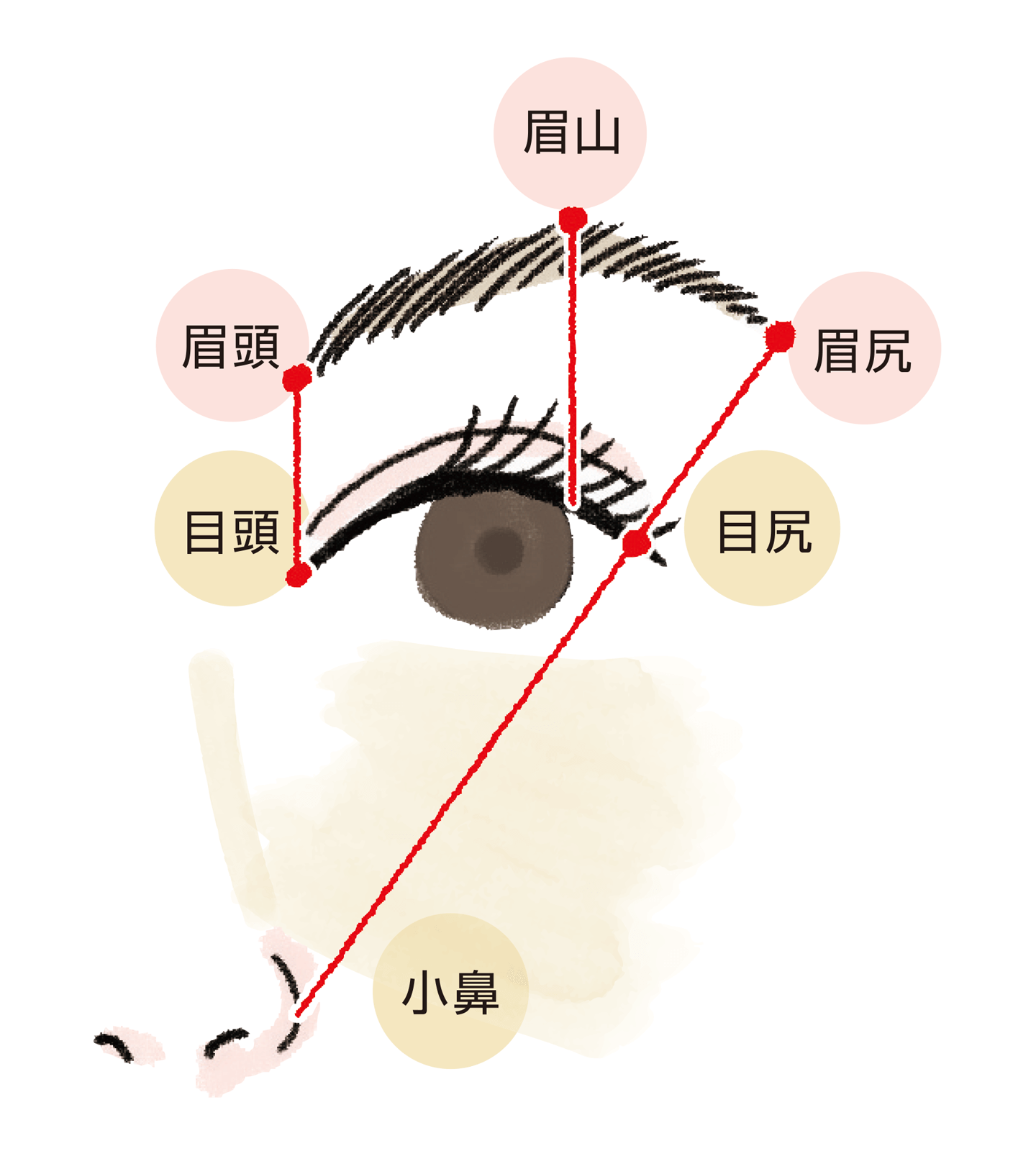 右のイラストを参考に形を整えると、バランスの良い眉に仕上がります。アイブロウペンシルで輪郭を描き、次にアイブロウパウダーで隙間を埋めていきます。