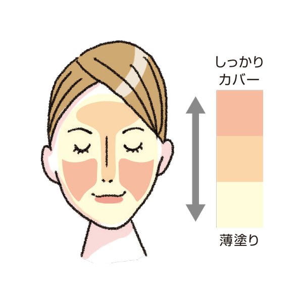 ファンデーションはしっかりカバーしたい部分から塗ります。顔の中心から外側へやさしくおさえるように塗ることで、立体感が生まれます。