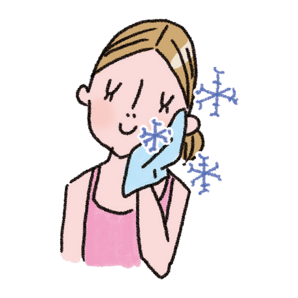 保冷剤をタオルで包み熱をもった肌に当てて、ほてりをとります。赤みが落ち着くまでは患部を温めないようにして下さい。