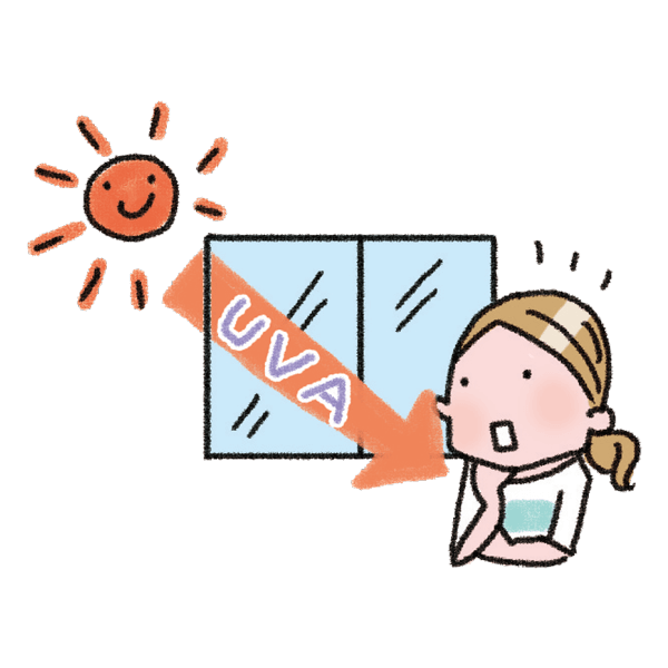 肌の奥まで到達して老化現象を引き起こすUVAは、窓ガラスを通り抜ける性質があります。室内にいても日当たりのいい場所では日焼けをする可能性があるので、外出しない日もUV対策をして下さい。
