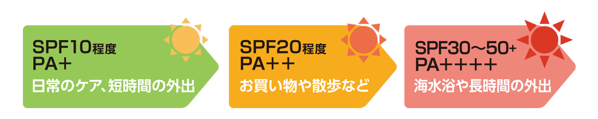 紫外線には、肌の奥まで届いてシワやたるみにつながるUVAと、肌に炎症を起こしてシミ・そばかすの原因になるUVBがあります。日焼け止めにはUVAの防止効果を示す「PA」、UVBの防止効果を示す「SPF」という表示があります。PAやSPFの数値が高い日焼け止めは肌に負担がかかるため、紫外線を浴びるシーンや時間に合った日焼け止めを使い分けましょう。