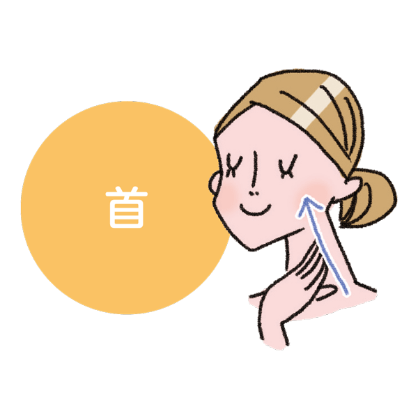 ジェルやミルクタイプは10円玉大、クリームタイプはパール3粒大を数カ所にのせ、首の下から上へなじませる。首のうしろも忘れずに。