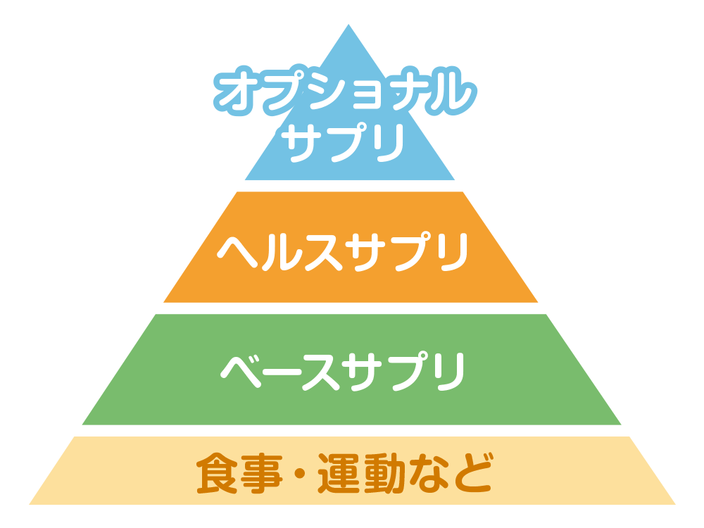 健康的な体づくりの一番の土台となるのは、毎日栄養バランスのとれた食事を摂ることです。しかし、食事だけで十分な栄養を摂取するのが難しい場合はサプリメントを上手に活用しましょう。まずはベースサプリメントで体の基礎を整え、必要に応じてヘルスサプリメントやオプショナルサプリメントを取り入れます。