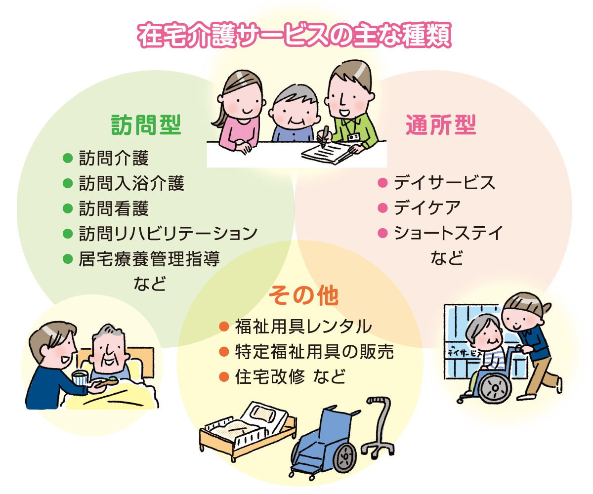 自宅で介護をする場合、ホームヘルパーなどに自宅を訪問してもらう訪問介護や施設に通ってサービスを受ける通所介護などさまざまなサービスが利用できます。本人や家族の状況や希望に合わせてプランを立てることが大切です。