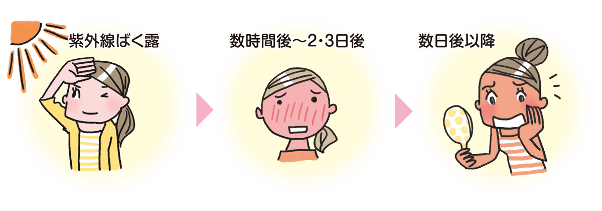 紫外線を浴びて数時間経つと、赤くなって痛みや水ぶくれなどの症状が出るサンバーンが起こり、その後、肌が黒っぽくなるサンタンが起こります。日焼けをしたら早めのケアが大切です。
