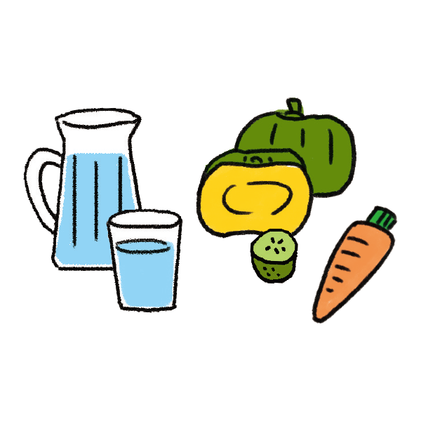 肌の修復に必要な水分や、かぼちゃ・にんじん・キウイフルーツなどのビタミン類を多く含む食品で栄養を補給します。