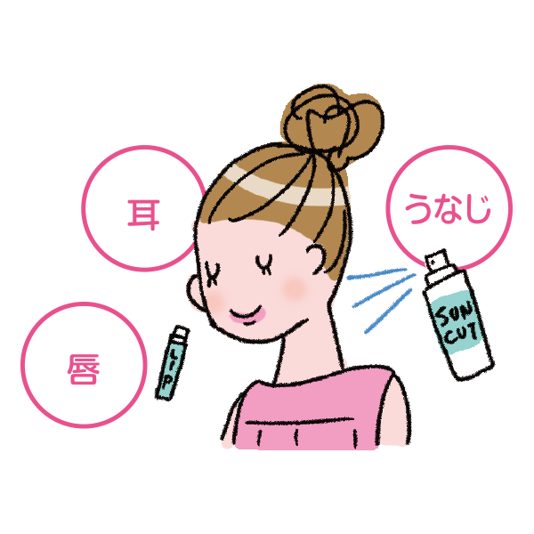 耳や唇、うなじなどは、UVケアを忘れがちな部分です。スプレータイプの日焼け止めやUVカット効果のあるリップクリームを使って、うっかり日焼けを防ぎましょう!
