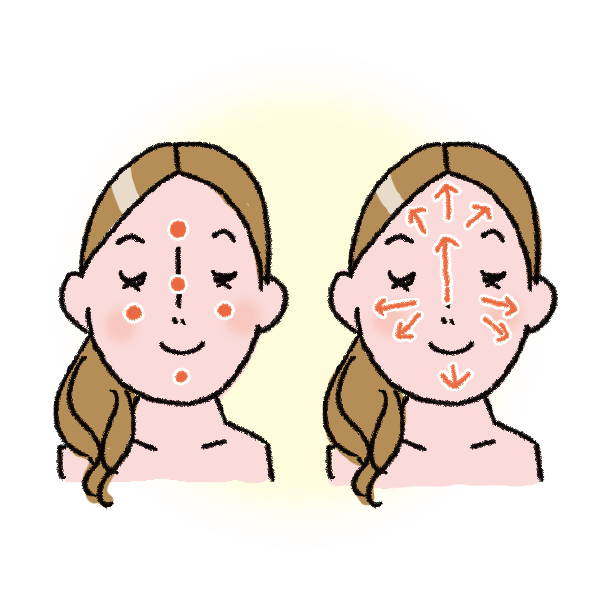 おでこ・鼻・両頬・あごに置き、中指と薬指で内側から外側へなじませます。