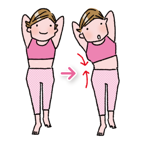 - 息を大きく吸い、吐きながら上体を右足の方へ傾ける。5秒キープし、息を吸いながら上体を戻す。