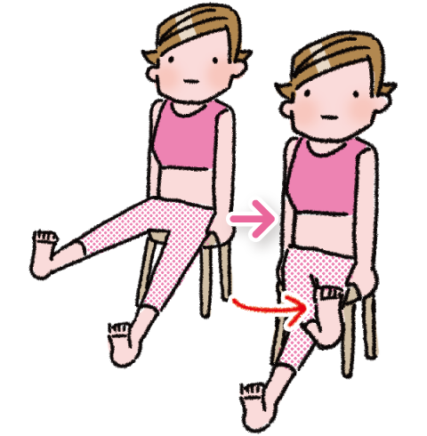 - イスに浅く座り、両手でイスの端をつかんでひざ裏を伸ばす。