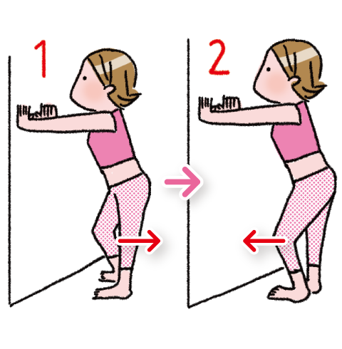 - 足を軽く開いて壁に手をつける。
