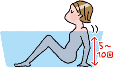 湯船の中なら、浮力で楽にエクササイズができます。両手を体の後ろにつき、おしりを浮かせてひじを5〜10回曲げます。