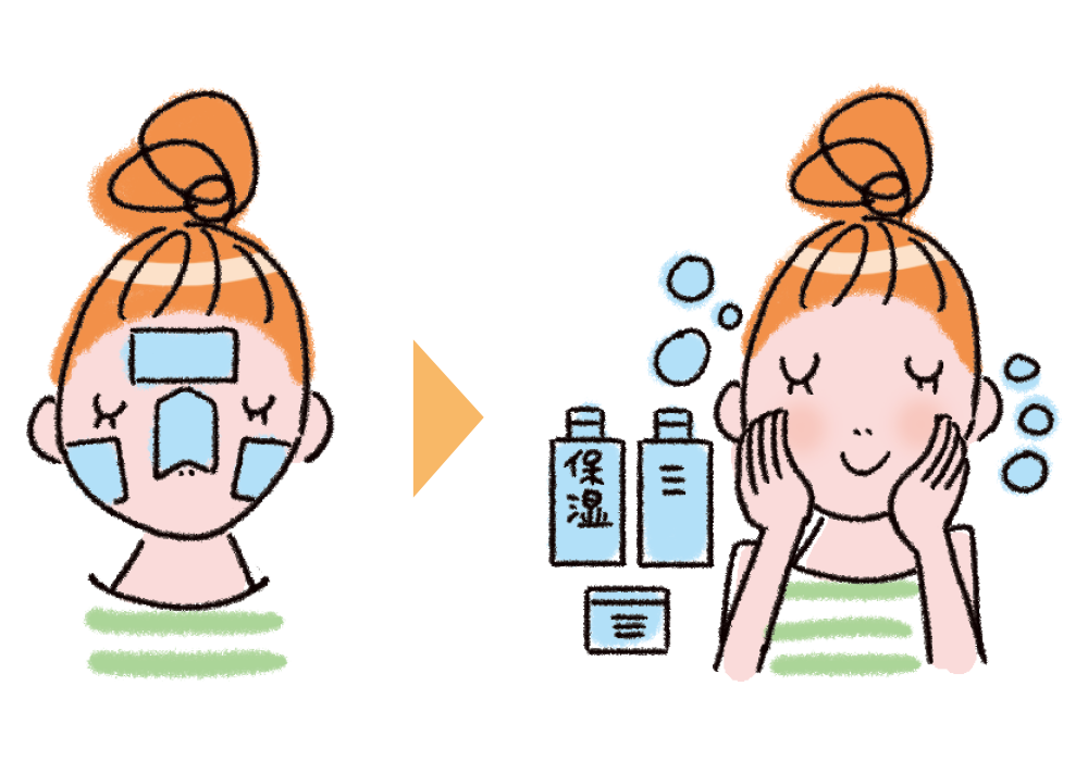 化粧水や乳液、クリームで保湿をすることで、皮脂の過剰分泌や肌の乾燥を防ぎます。毛穴の目立つ部分には、化粧水を含ませたコットンを5分程度貼り、乳液でうるおいを閉じ込めます。