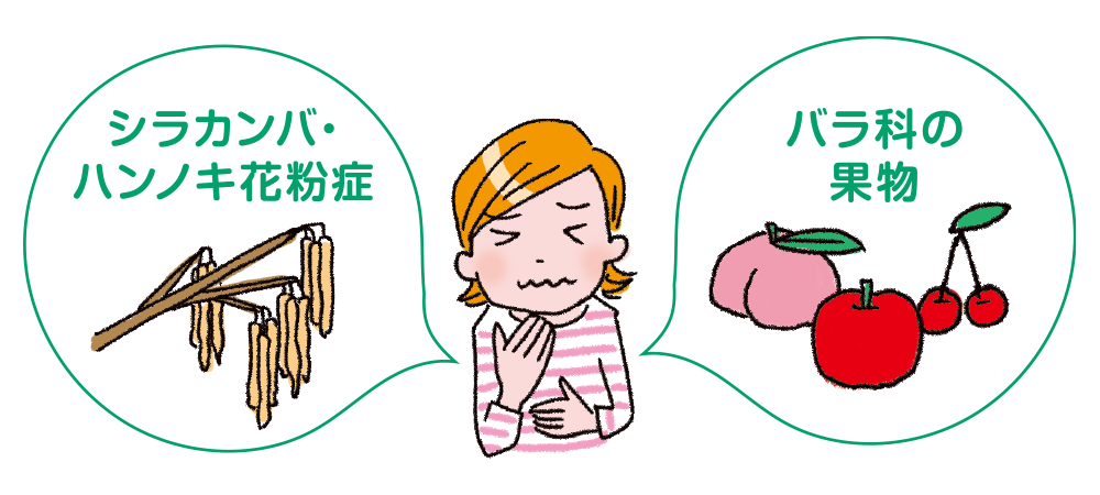 ある特定の果物や野菜を食べた後、15分以内に口や唇、のどなどにかゆみや腫れ、イガイガ感などのアレルギー症状が出ます。花粉症の人に多く見られ、とくにハンノキ、シラカンバなどのカバノキ科の植物に反応する人が、リンゴやモモなどバラ科の果物を食べた際に現れることが多いので、注意が必要です。