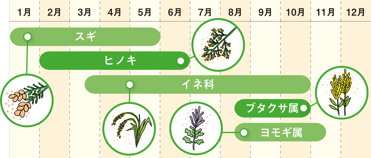 花粉は種類によって飛散時期が異なり、代表的なスギ花粉は早い地域で1月下旬から飛び始めることもあります。自分はどの花粉に反応するのかを把握し、飛散時期に合わせて早めに対策をすることが大切です。