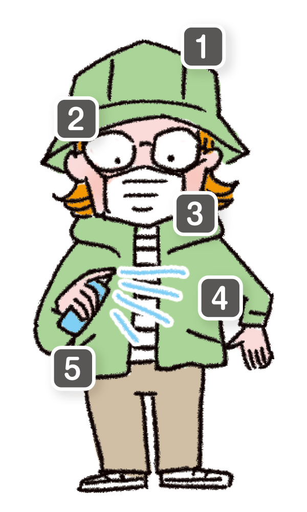 髪の毛に花粉が付かないように帽子を着用し、長い髪はまとめます。