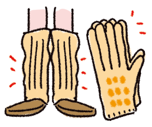 手袋やレッグウォーマーなどで、手首・足首を温めます。