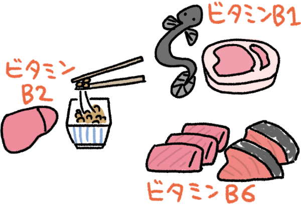 ビタミンB群を補給すると、エネルギー代謝を高めて疲労感を解消できます。とくに疲労感やストレスを感じたときには、うなぎや豚肉に含まれるビタミンB1、寝不足による肌荒れや口内炎の改善にはレバーや納豆に多いビタミンB2、倦怠感にはマグロやカツオに豊富に含まれるビタミンB6をとりましょう。