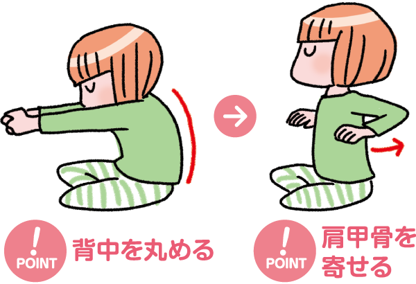 2おへそをのぞき込むように背中を丸め、両手を組んでまっすぐ前に突き出す。