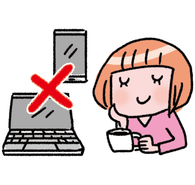 スマホやパソコンなどを見ていると、脳に情報が入ってくる状態が続きます。デジタル機器を見ない時間をつくると、脳と体の緊張がほぐれてリラックスできます。