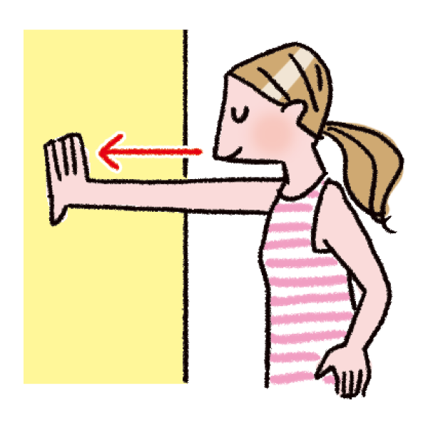 ②右腕をまっすぐ伸ばし、指の腹を壁につけて体重をかける。