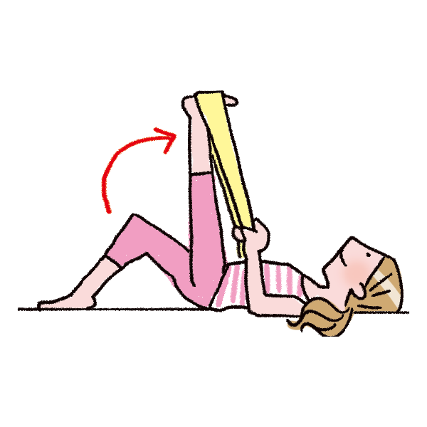 ①仰向けで寝て左足にタオルをかけ、上に向かって足を上げる。