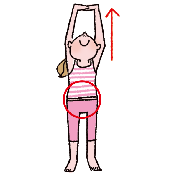 ①足を肩幅に開き、両手を組んで上へ伸ばす。