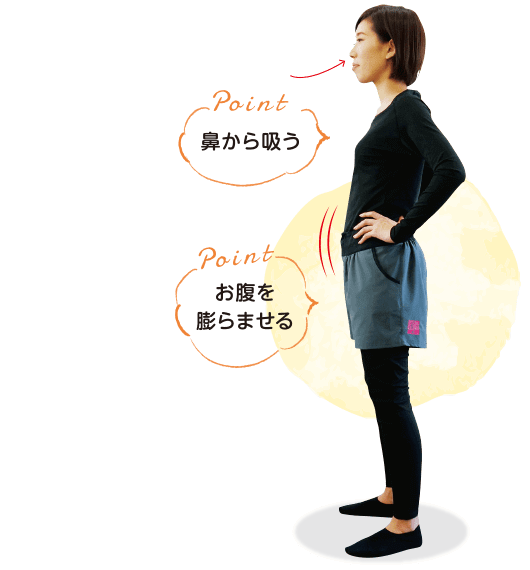 背筋を伸ばして立ち、鼻から息をゆっくり大きく吸い込み、お腹を膨らませる。
