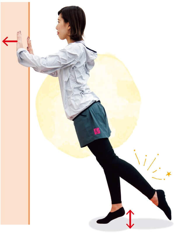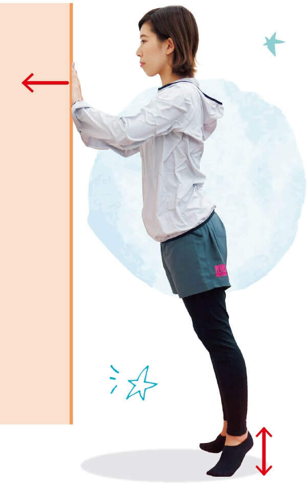 壁に両手をついて、両足のかかとをくっつけたまま、つま先をできるだけ外側に開いて立つ。
