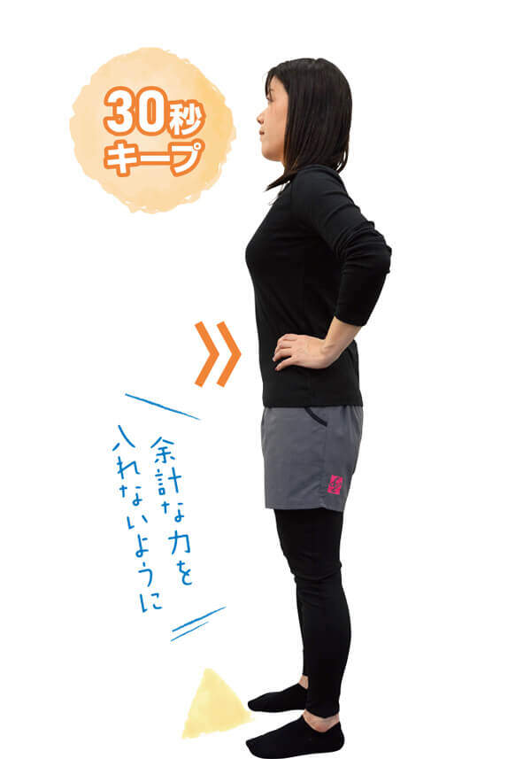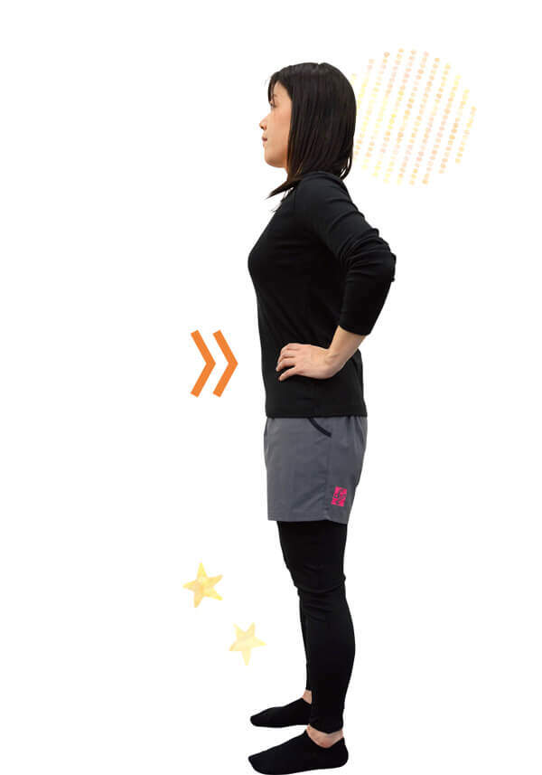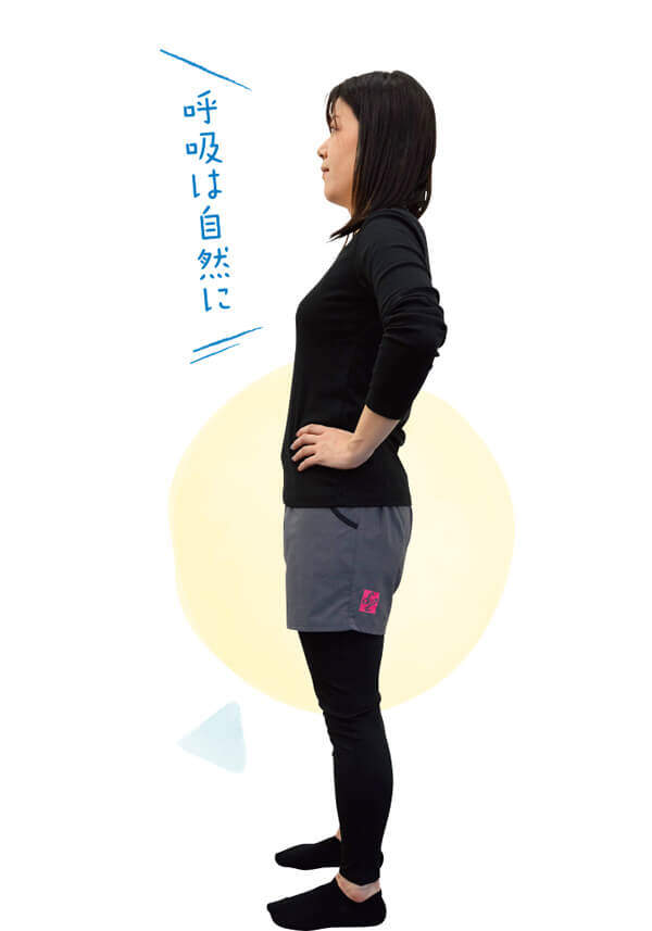 腰に手をあてて、背筋を伸ばして立つ。
