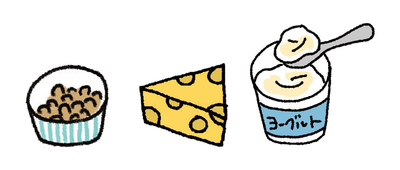納豆、チーズ、ヨーグルト、キムチなど