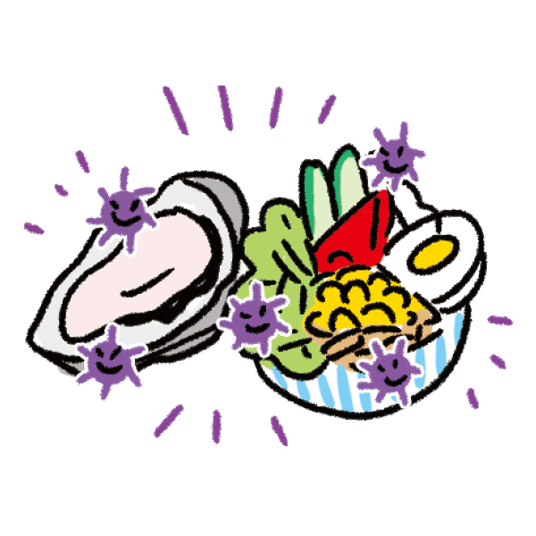 • ウイルスに汚染された生牡蠣や貝類を十分に加熱しないで食べる。