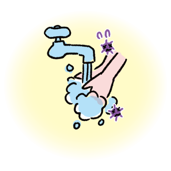 とくに食事前やトイレの後、調理の前後は石けんでよく洗い、流水で十分に流しましょう。