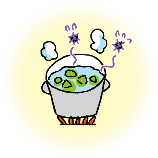 まな板、包丁、食器、ふきんなどは使用後すぐに洗いましょう。熱湯(85℃以上)で1分以上の加熱消毒が有効です。