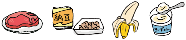 肉類(鶏肉、赤身肉)・魚介類・大豆製品・バナナ・乳製品・玄米など