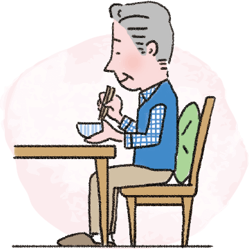 イスに深く腰かけ、両足を床に付けて、あごを引いた姿勢にします。口をしっかり閉じて、きちんと飲み込みましょう。