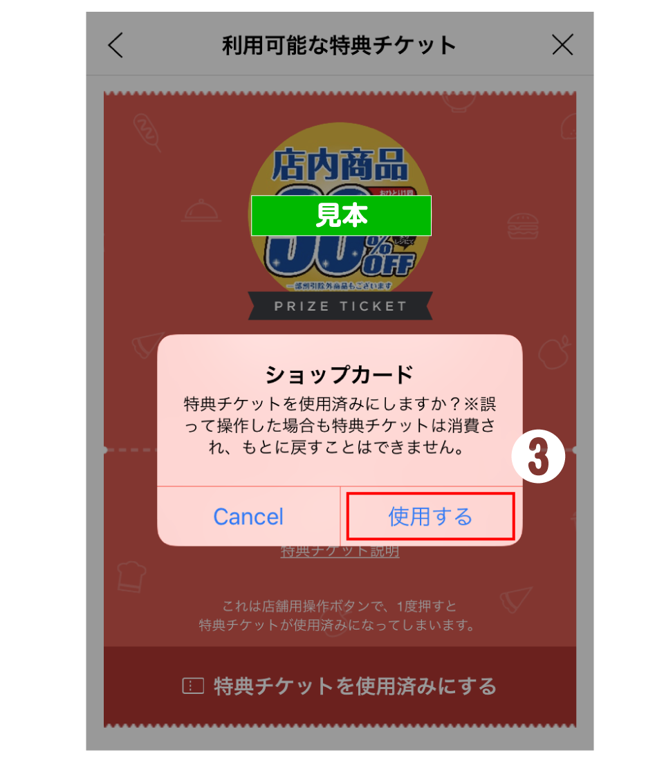 ❸ 店舗スタッフと一緒に画面を確認しながら、「使⽤する」をタップする