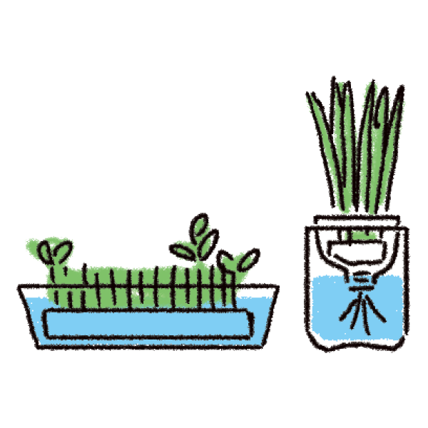 水耕栽培は、土の代わりに肥料を溶かした水で栽培する方法です。土を使わないので室内でも栽培でき、天候や虫の影響が少ないのが魅力です。容器もタッパーやペットボトルなど、手軽なもので始められるので人気を集めています。