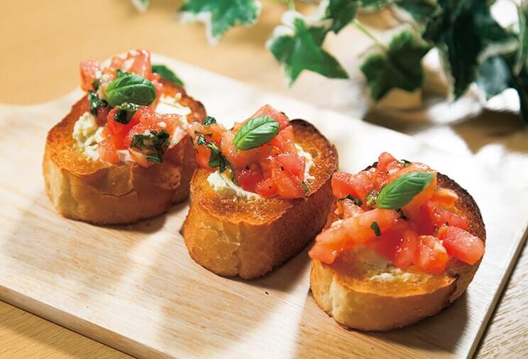 4. フランスパンは1.5~2cm幅に切り、表面にオリーブオイルを塗ってトースターできつね色になるまで焼く。
