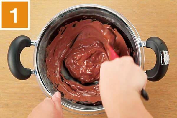ボウルに刻んだチョコレートを入れ、湯せん(分量外)しながら溶かす。ボウルの中にお湯が入らないように注意する。 |