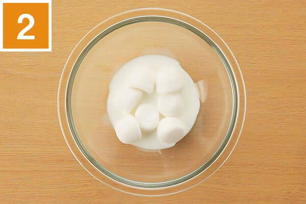 耐熱容器にマシュマロ・牛乳を入れ、ラップをかけて電子レンジ(500W)で90秒間加熱し、よく混ぜる。 |