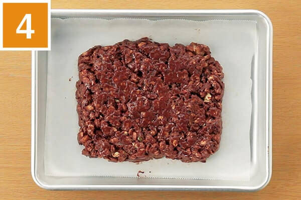 クッキングシートを敷いたバットに3を流し入れ、表面を整えてから冷蔵庫で1時間ほど冷やし固める。 |