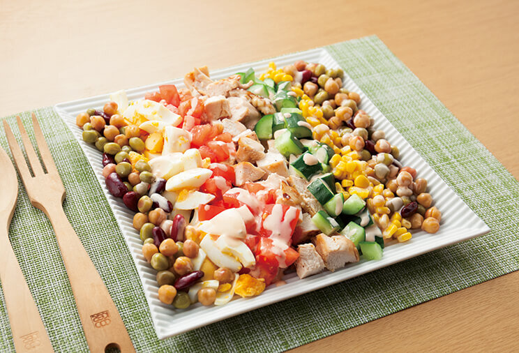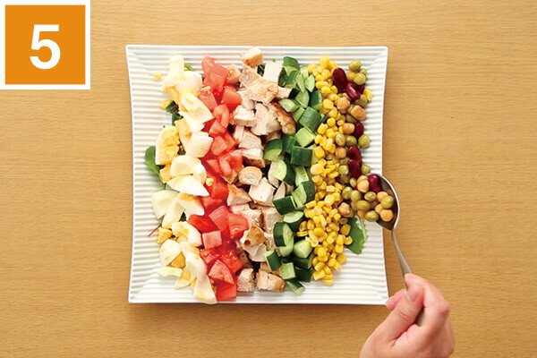 皿にベビーリーフを敷き、23・ミックスビーンズを一列に盛り付け、4のドレッシングをかけて完成!